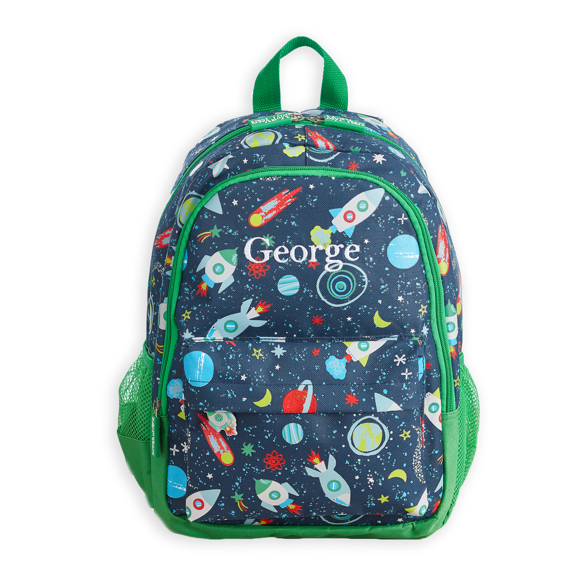 in a totally space-tacular print. Perfectly sized for pre-school aged children this bag fits in the school essentials including pencils and drink bottles. You can personalise the backpack with up to 9 characters and it will be embroidered for free and sent