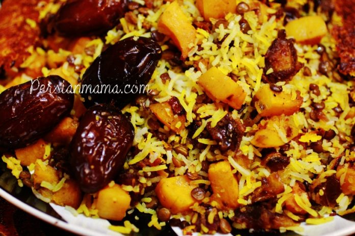 Adas Polo ba Kadoo Halvaii is a beautiful and delicious Persian lentil rice with roasted butternut squash, Medjool dates (khorma) and warm spices (advieh).