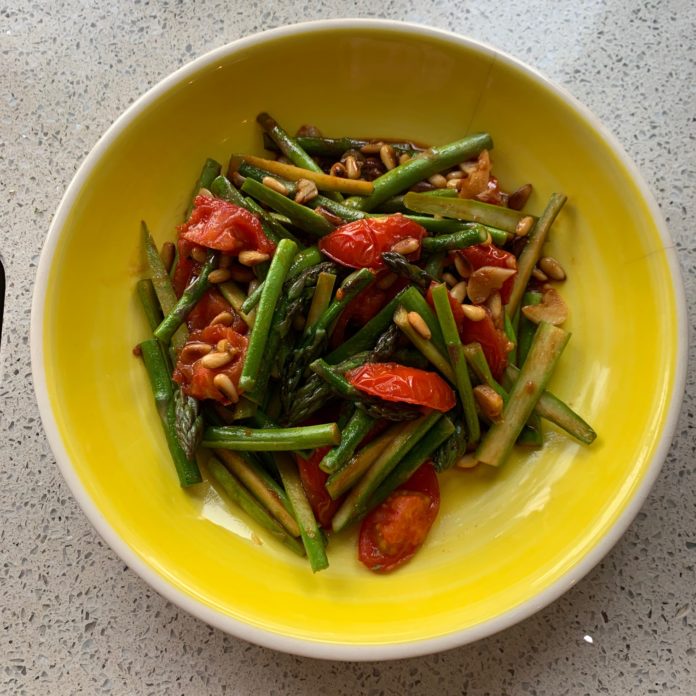 Asparagus, cherry tomatoes and pine nuts