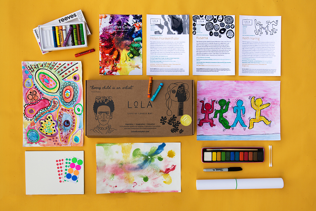 LoLA – Lots of Lovely Art is a magical, educational art box for children of all ages delivered directly through your letterbox. Each box of LoLA (age 6+), and LoLA for Little Ones (age 3+) is filled with high-quality art materials, beautifully constructed information sheets on artists and galleries, and lots of inspiring artist-based projects. Each LoLA box celebrates an overall art theme and three relevant artists. Included is a special section called ‘LoLA recommends’ which lists suggested reading and related gallery visits. Seeing the work of artists who feature in a particular box in local museums, galleries or exhibitions aims to enable children to absorb art in a multi-faceted way.Fantastic Flowers, Sculpture Surprise, Portrait Party, Tactile Texture and Abstract Action are just some of the themes to date. Art Projects are offered with carefully planned activities relevant to the age range. The LoLA boxes deliver a generous amount of beautifully selected art supplies that allow a child to build up their very own art cupboard. Varying each month, the boxes encourage children to experiment with different materials, such as acrylic paints, oil pastels or water paints. Buy a box or subscribe online www.lotsoflovelyart.com