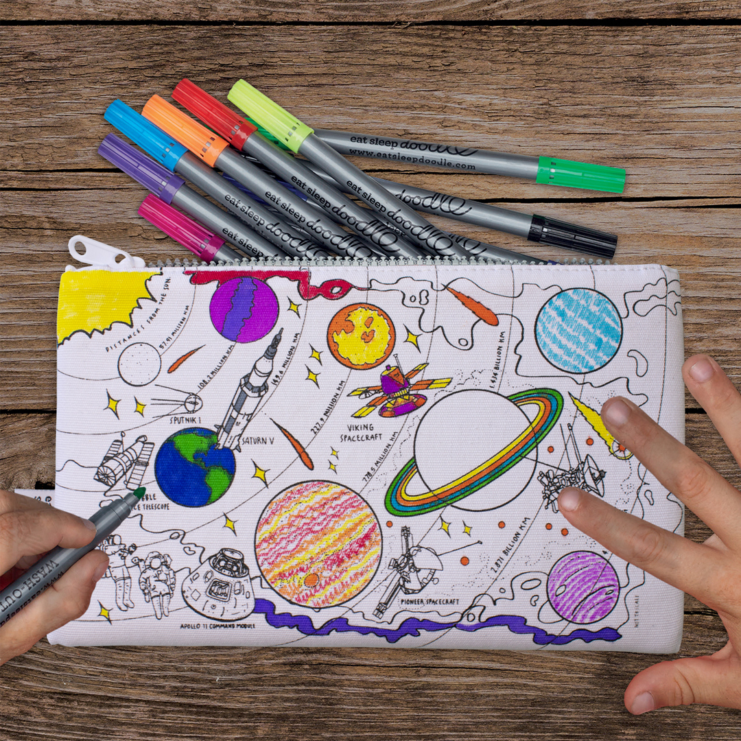 Ensure yours is the coolest kid in school with eatsleepdoodle’s fun colour-in pencil cases! Design options include dinosaurs, butterflies of the world and our classic notebook print for completely freestyle designing! Brand new for back to school is space explorer pencilcase. Complete with a cool red, white and blue zipper, it features the historic moon landing on one side and the order of the planets and solar system on the other. It’s huge fun to colour in with so much learning to absorb at the same time: all our designs come backed up with lots of fun facts and educational info on our website.