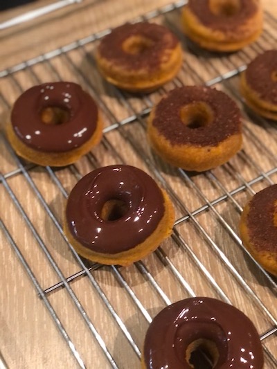 - Pour the mixture into your doughnut or muffin trays and bake for 15-20 min or until a skewer comes out clean.
