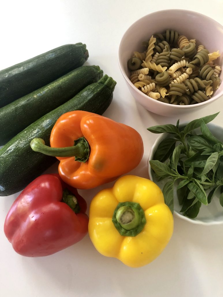 2. Cook garlic in olive oil until fragrant. Then add zucchini & red pepper. Cook for 6-8 minutes or until they begin to soften.