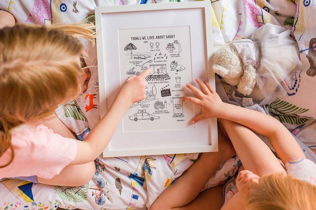 Choose your favouite memories and we will doodle them. A doddle to organise, simply respond to the questions we provide (some require selections from a list and others require specifc answers) and we will do the rest. We know that there are many different people playing the role of ‘daddy‘ so if you’d like your print to be addressed to a named person instead thats no problem. After we have worked our magic, we will send you a digital proof to approve before the print is dispatched. Photography credit: Nina Mucalov.