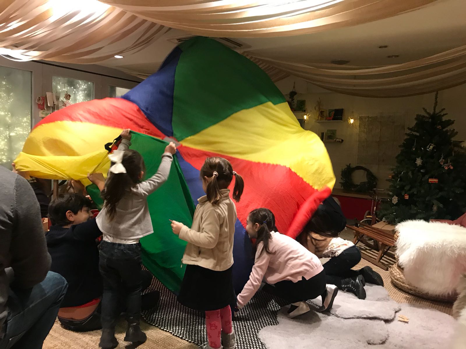 At our arrival we parked our buggies and left our coats in the cloackroom while the super nice staff led us to Santa’s Secret Hideaway – a cosy place full of toys and books from Santa’s workshop. There, we all enjoyed Christmas crafts where we transformed patterned paper into tree decorations. Our three years older also enjoyed story telling, and singing sessions.