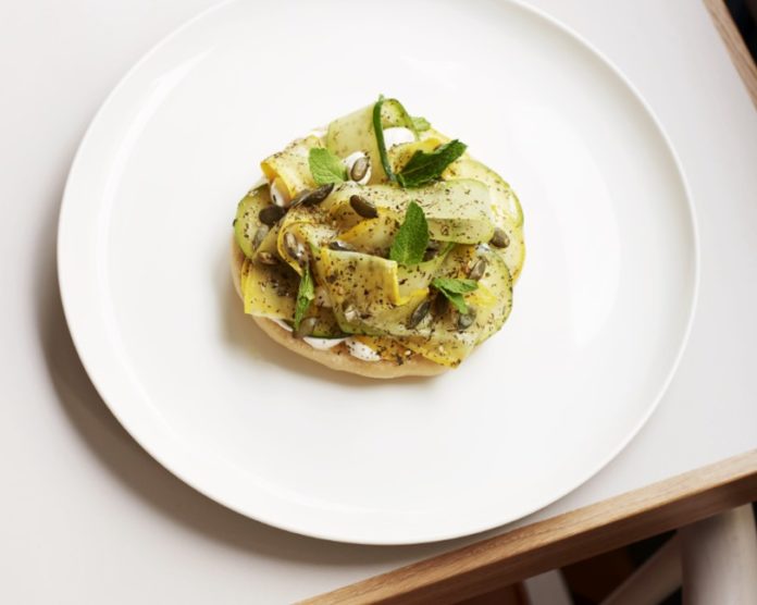 Serve the flat breads warm and cover with a generous helping of taramasalata, top with the sliced courgettes and season with salt and pepper