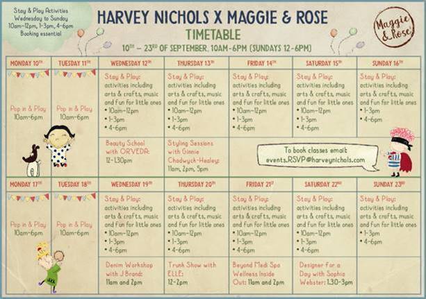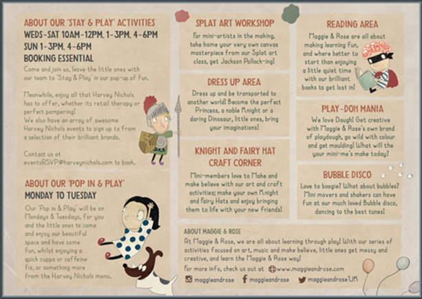 There will be a crèche and fun space for children, and a lounge area for adults, complete with snacks and a bar menu. Throughout the pop-up, Harvey Nichols and Maggie & Rose will also be hosting events and exclusive offers, including: