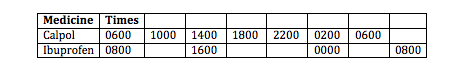 This is an obvious one and is used to help reduce fever and treat general pain relief. Calpol can be used every 4-6hours and Ibuprofen every 8 hours. They can be used at the same time but I find I get the best results if I alternate the two over 24hrs. Here is an example:-