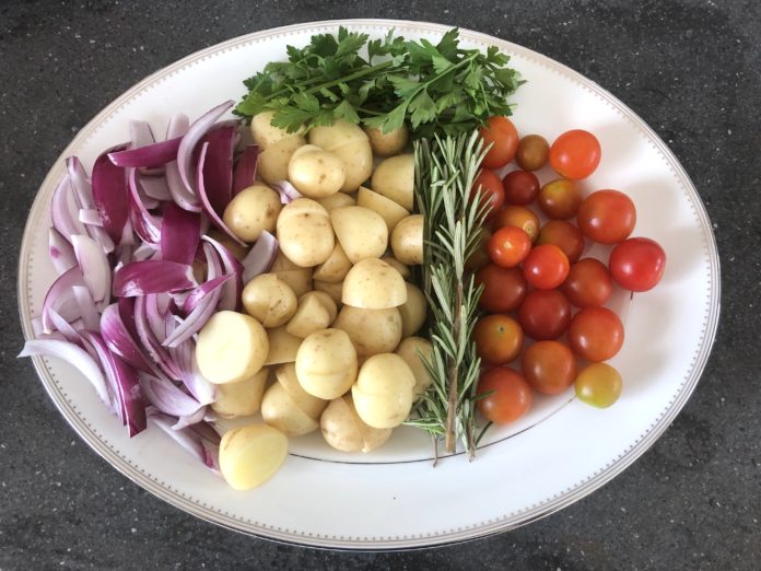 Preheat the oven to 200°C, gas mark 6. Place the potatoes and oil into a roasting tin, toss to combine then season. Bake for 15 minutes. Add the onion, tomatoes, balsamic vinegar and rosemary, mix, then return to the oven for a further 10 minutes.
