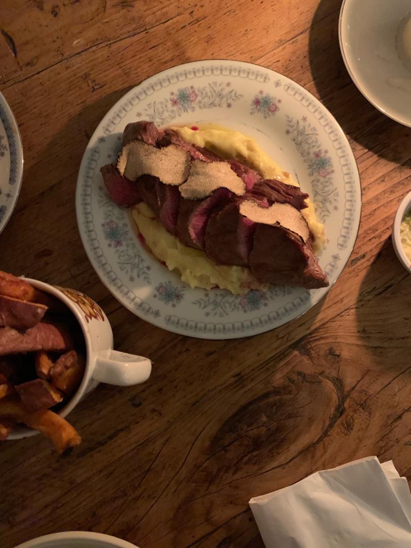 6oz Fillet Steak 18 Potato & Celeriac Puree, Shaved Truffle – simply amazing the filet was super tender and cooked to perfection – blue – with sliced truffles on a bed of whipped mash – our favourite dish by far!