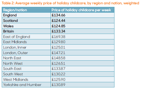 Prices vary across the country: in the East of England, a week of holiday childcare costs £169 on average – 34 per cent more expensive than the West Midlands at £126 per week.