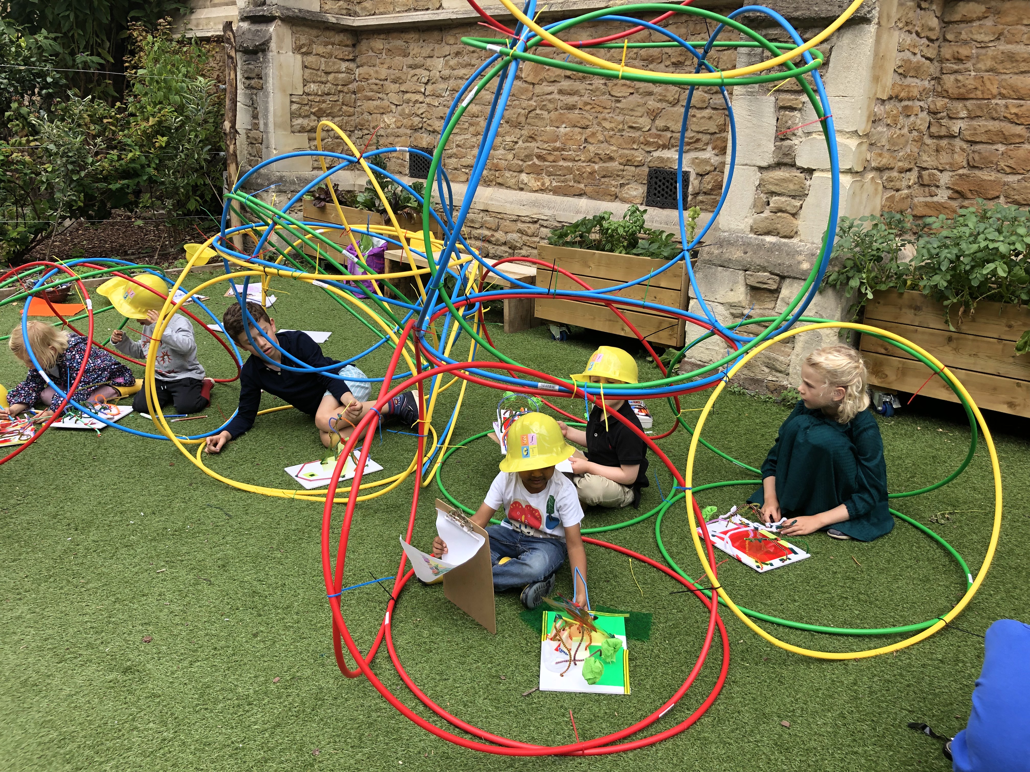 The children were encouraged to imagine their own dream homes and we all donned our safety hats and worked as a team to create a structure made out of hula hoops.