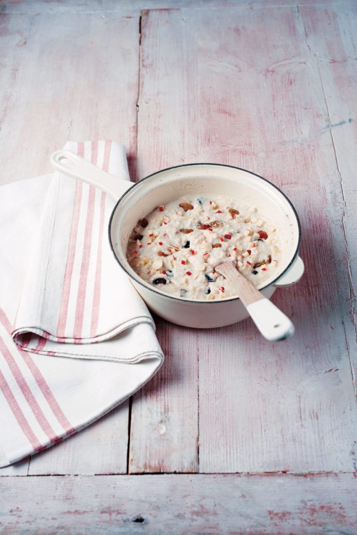 Get your little ones to scatter over some frozen berries to cool it down, drizzle some honey on top to taste 10 mins. Put the oats in a pan with enough milk to cover and a sprinkle of salt. Heat gently and stir for 2–3 minutes. Stir in the cinnamon, dates, raisins and apple, and cook for 5 minutes. (Add a bit more milk if the mixture gets too dry.) Stir through the quinoa flakes and cook for another couple of minutes, continuing to add milk if needed, until thick and tender. Divide between bowls, sprinkle with the almonds, drizzle over the maple syrup and serve with a pinch of cinnamon.