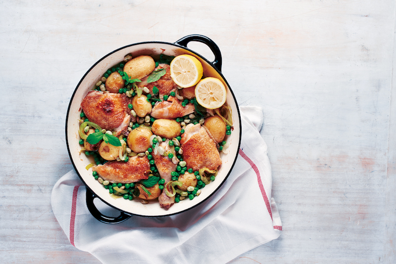Heat the oil in a large pan and brown the chicken on each side for 5–10 minutes. Turn the heat down a little, add the garlic, onions and leeks, and cook for 5 minutes, stirring, until softened. Pour in the stock and add the new potatoes. Season with salt and pepper, and simmer gently for about 20 minutes until the chicken is cooked and the potatoes are tender. Add the fresh peas and broad beans, if using, and leave to simmer for 3–5 minutes until softened and bright green. Squeeze over the lemon juice and stir through with the mint leaves to serve.