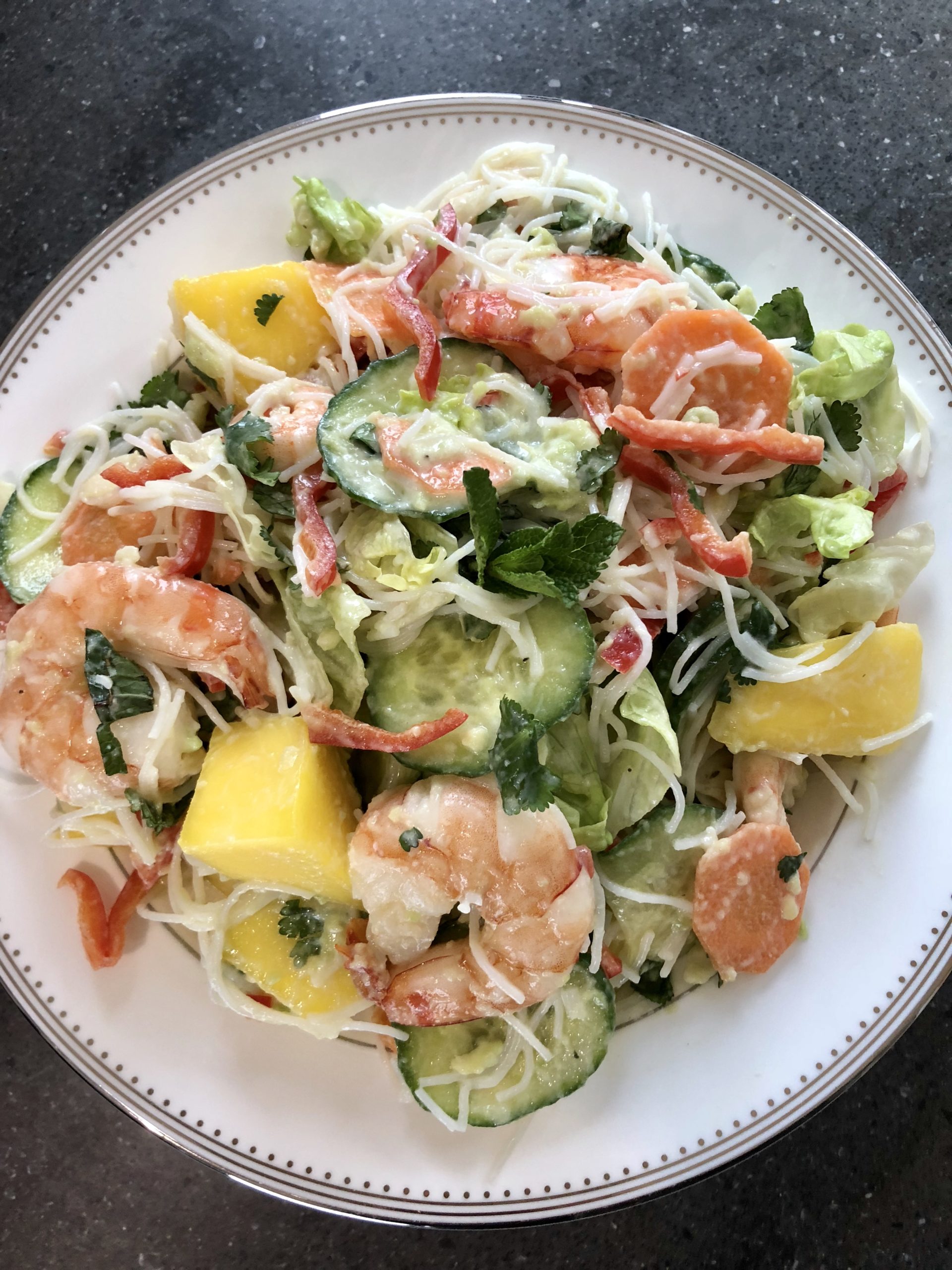 Place the noodles, prawns, mango, cucumber, carrot, pepper, spring onion, lettuce, chilli, coriander and mint in a mixing bowl. Drizzle over half the dressing and toss gentle to combine.