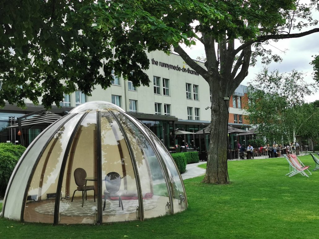 We arrived at Runnymeade Hotel on a sunny afternoon.  It is a hidden gem just off the motorway, but it’s remarkably quiet. Which we liked. There was a lot of green around as we walked around the hotel premises.