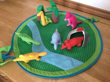 The brightly coloured Fairtrade Dinosaur Play Set is a great introduction for little ones to the wonderful world of Tyrannosaurus Rex and friends. The zip-up pouch opens to reveal an integral river and volcanic cave, where the six brightly coloured mini dinos can play among the trees