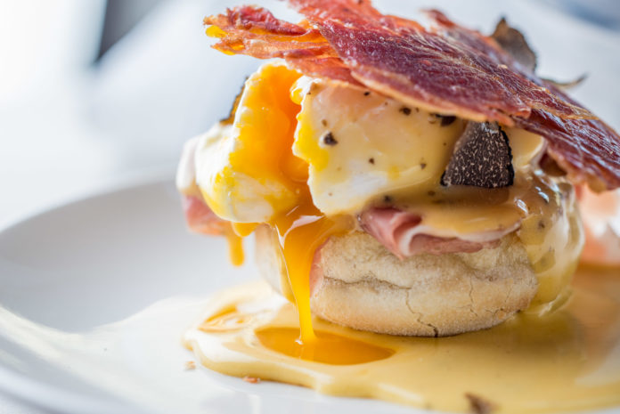 - To serve, slice each muffin in half, toast them under the grill and spread with butter. Arrange 1 slice of uncooked parma ham on top and put the muffins back under the grill briefly to warm. Season the eggs with salt and pepper, carefully place one on each muffin half and ladle over the truffle hollandaise. Garnish with a 1⁄2 slice of the crispy fried parma ham.