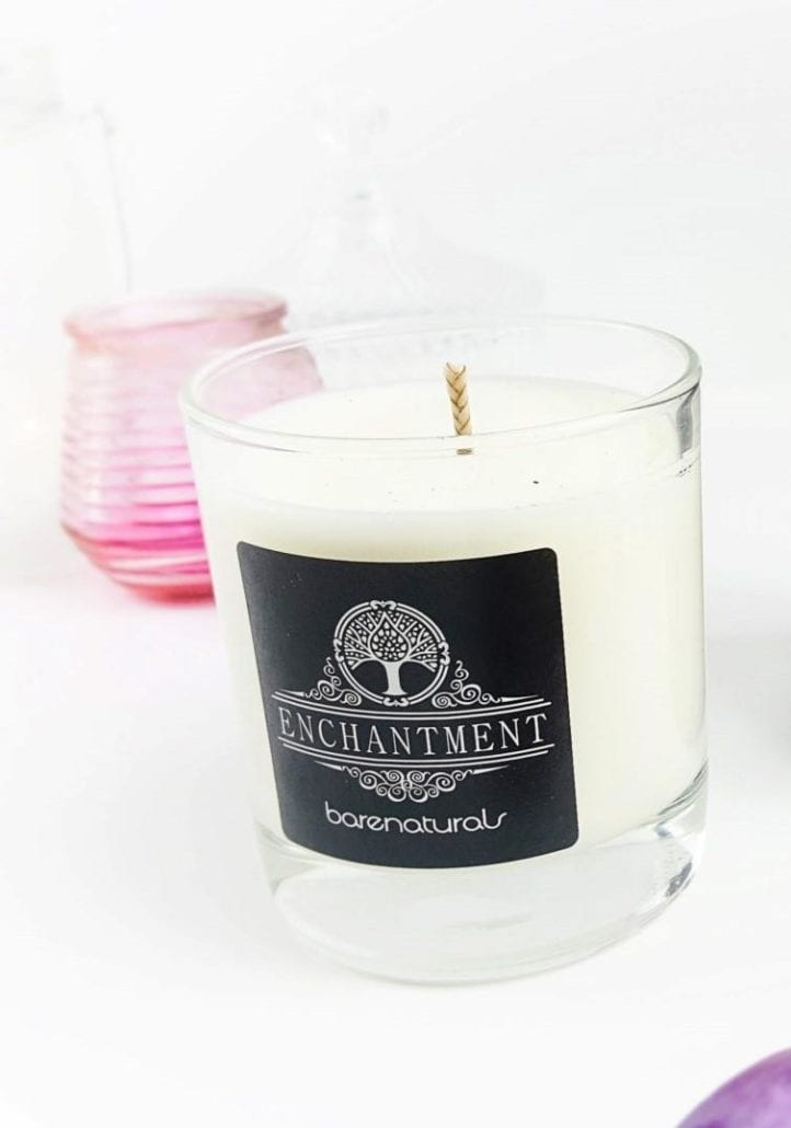 Barenaturals enchantment candle: Succumb to the uniquely scented aromatherapy natural soy candle and indulge your senses in the soothing aroma of rose, lavender and geranium.