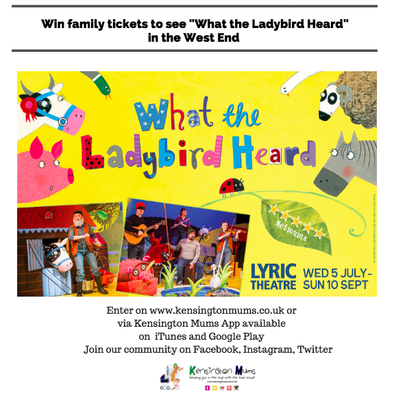 Competition opens 14th of August 2017 to 28th of August 2017 • One winner will receive a family ticket (four tickets, minimum 1 adult) to see What the Ladybird Heard at the Lyric Theatre, Shaftesbury Avenue – The prize is non-transferable and there is no cash alternative • Valid for Wednesday to Sunday performances until 10 September, subject to availability -Travel and accommodation not included -Kensington Mums will choose and contact the winners of the competition within 24 hours of the competition ending by email • All entries must be subscribed with www.kensingtonmums.co.uk or have downloaded our KM app on iTunes or Google Play • The prize is not to be used for resale • Entrants must be over 18 • Winner will be emailed • UK entries only •
